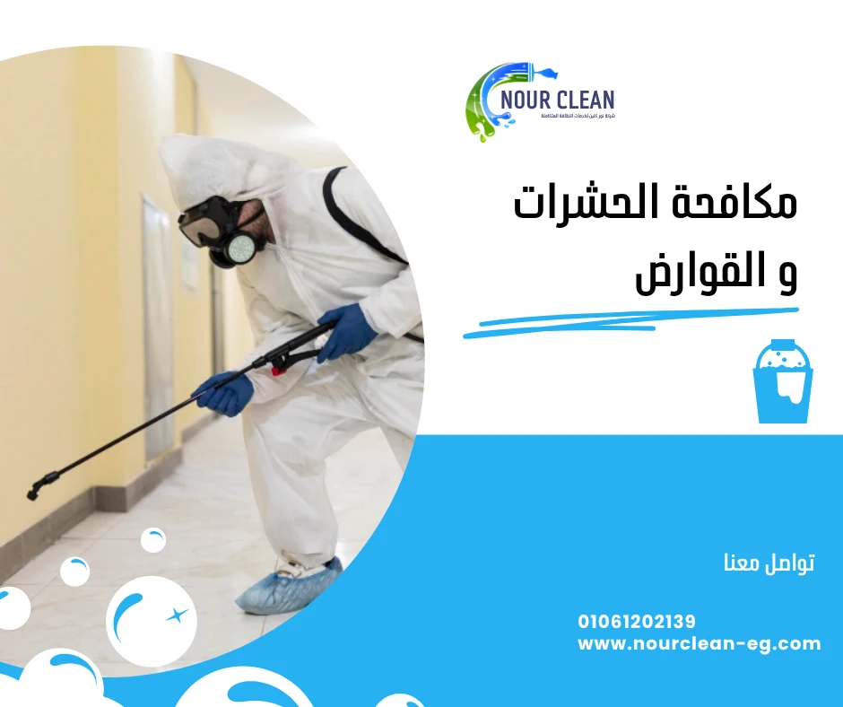 ا تدع القلق يسرق راحتك. رؤية الحشرات أو القوارض في منزلك أو مكتبك ليس مجرد إزعاج، بل هو تهديد للصحة والسمعة. في “نور كلين”، نقدم حلول مكافحة آفات علمية وآمنة، تعتمد على مبيدات مصرح بها (آمنة للأطفال والحيوانات الأليفة) وفنيين خبراء. نحن لا نرش فقط، بل نقضي على المشكلة من جذورها ونقدم لك ضماناً فعالاً لراحة بال تامة.